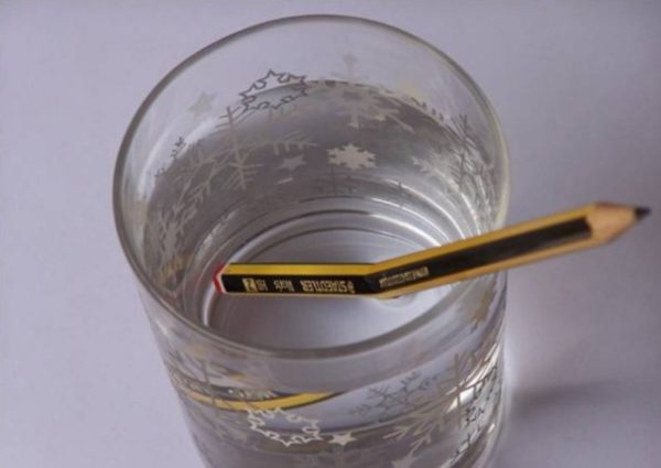 -Ahora coloque el lápiz en el vaso de vidrio con agua de modo tal que una parte quede sumergida y la otra al aire.